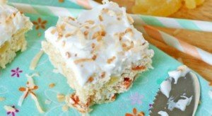 Ha kész, kivesszük a hűtőből a masszát, és ráegyengetjük a felvert tejszínes krémet, és megszórjuk a pirított kókusz pelyhekkel.