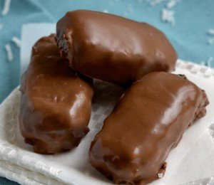 Vegyük ki a fagyasztóból a kókuszos szeleteket és mártsuk bele, az olvasztott csokoládéba, és tegyük vissza a tepsibe. Ha elkészültek a Bounty szeletek tegyük vissza a hűtőbe dermedésig.
