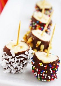 Vegyük ki a banán darabokat a hűtőből és forgassuk meg a csokoládéba és utána az apróra vágott mogyoró, kesudió, pisztácia apróra vágott darabkákkal, vagy kókuszpehely és dekor cukorkával is diszíthetjük.