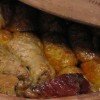 Ezt követően egy egész narancsot vágjunk félbe, 2 gerezd fokhagymával és 1 babérlevéllel együtt, helyezzünk el a csirke belsejébe.