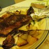 A krumplit pucoljuk meg, és vágjuk negyedekre. Egy tepsibe tesszük, 3 fej negyedekre vágott hagymával megszórjuk, és egy fél fej fokhagymával, sózzuk, borsozzuk, és olvasztott kókuszzsírban megforgatjuk, kis húsos szalonnát vágunk rá.